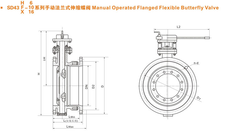 2、 伸缩蝶阀出厂时结构长度为最小长度、安装时可拉至安装长度。